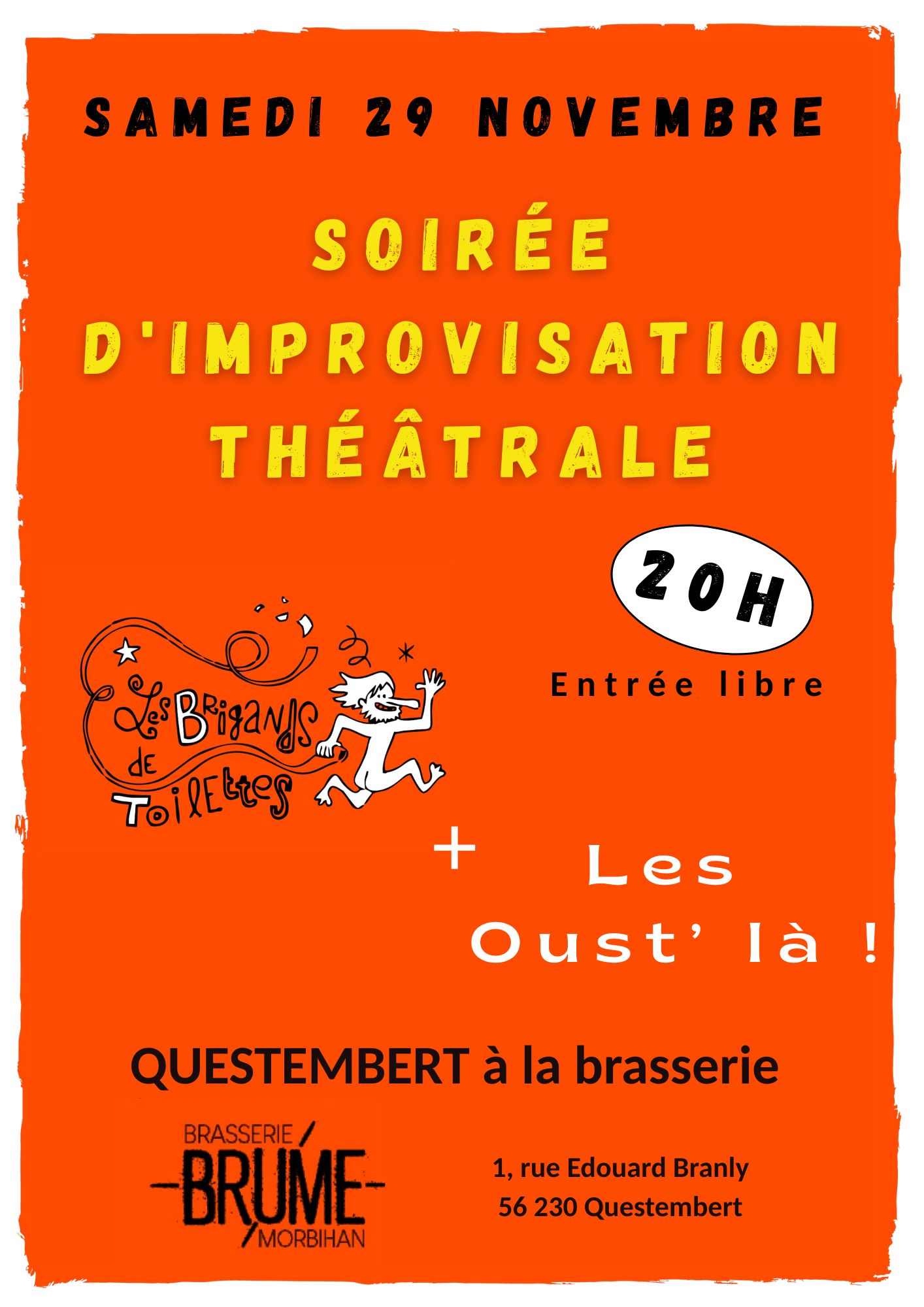 Les "Brigands de toilettes" (de Questembert) et les "Oust’ là" (de Malestroit) vous proposent une soirée d’improvisation théâtrale de 20h à 21h à la Brasserie Brume à Questembert le samedi 29 novembre à 20h.