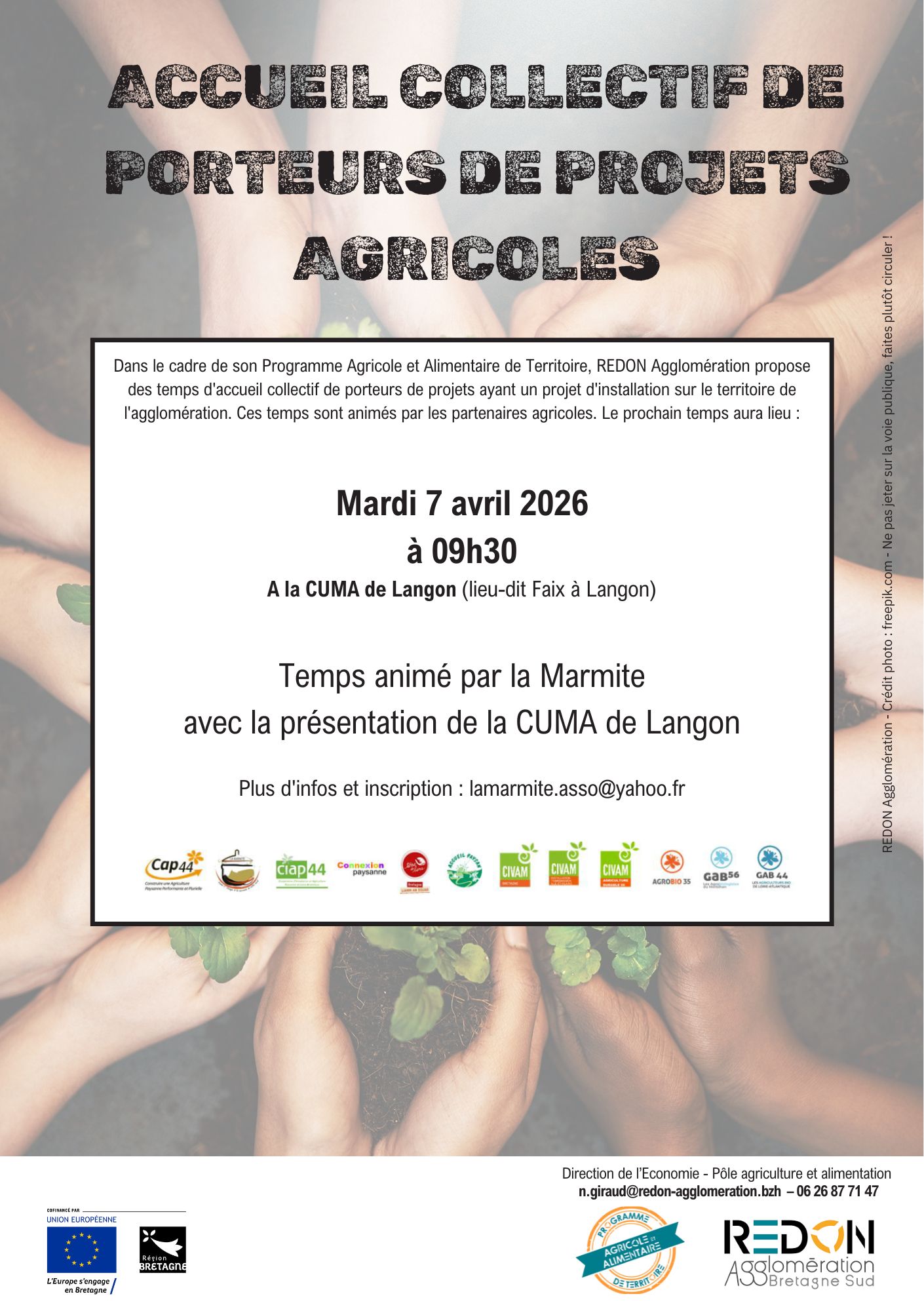Café Installation pour les porteurs et porteuses de projet du pays de Redon. MARDI 7 avril 2026 de 09h30 à 13 h à la CUMA de Langon (lieu-dit Faix à Langon), temps animé par La Marmite pour le réseau des agricultures durables du pays de Redon (Civam, Cap44, Gab, Ciap...)