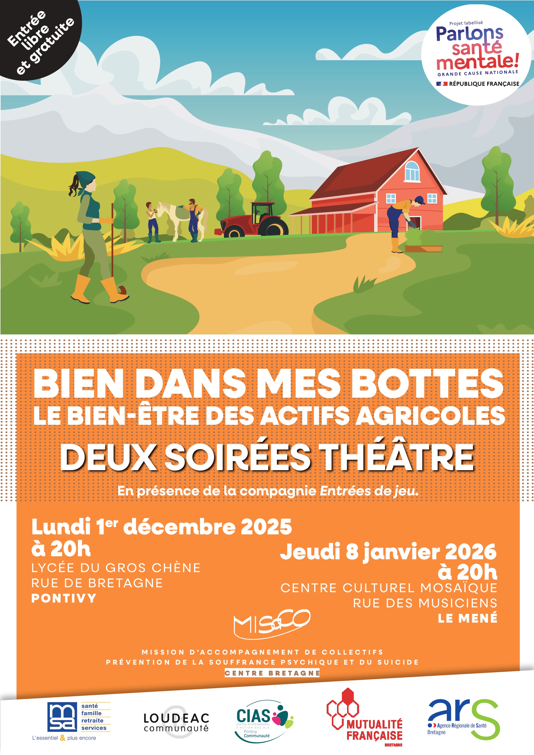 Aussi, le groupe de travail co organise une soirée théâtre débat « bien dans mes bottes » le lundi 1er décembre 2025 à 20h au sein du Lycée le Gros Chêne à Pontivy (entrée libre et gratuite), une seconde représentation de la pièce aura lieu jeudi 8 janvier sur la commune de Le Mené à 20h.