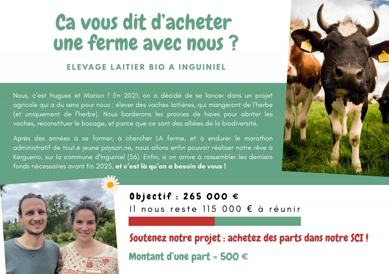 Nous reprenons une ferme près de chez nous, à Inguiniel dans le Morbihan (au lieu-dit Kergueno précisément !). C’est une ancienne ferme laitière, très adaptée au pâturage. Et nous en reprenons les rênes en Janvier 2026 !