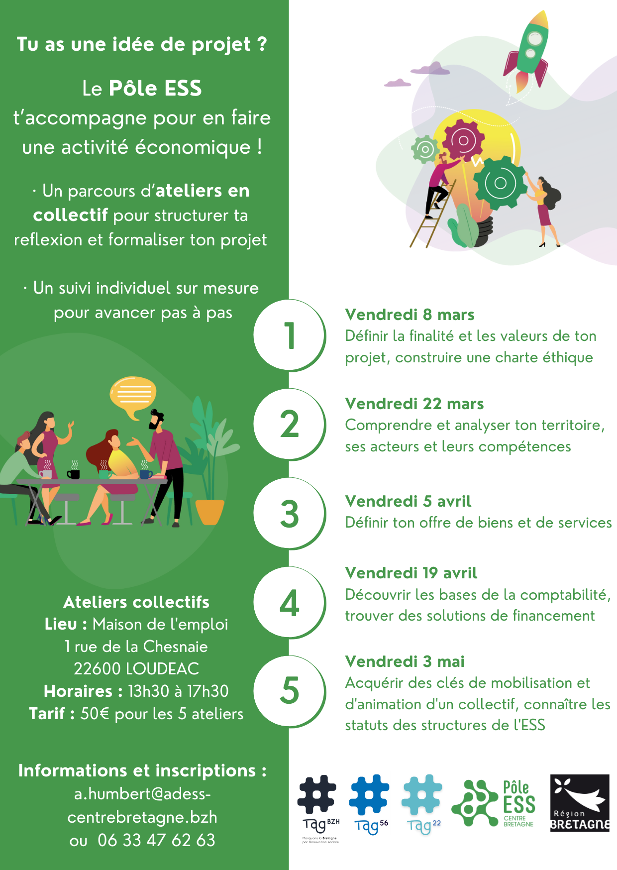 Les ateliers sont ouverts à toutes personnes souhaitant être accompagné sur une idée d’activité ou d’installation, ils auront lieu à la Maison de l’emploi à Loudéac (1 rue de la Chesnaie) de 13h30 à 17h30 aux dates suivantes :