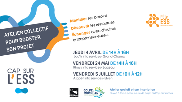 ci-dessous la communication pour les prochains ateliers « Cap sur l’ESS » destinés aux porteurs et porteuses de projet à impact social et/ou environnemental sur Golfe du Morbihan Vannes agglomération.