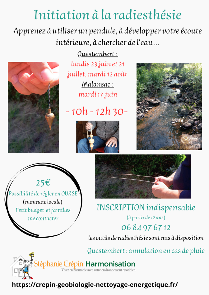 Ateliers d’initiation à la radiesthésie à Malansac et Questembert cet été.Pour apprendre à utiliser un pendule, développer ses ressentis, son écoute intérieure, découvrir les différents outils de radiesthésie : pendule, baguette de sourcier, baguettes parallèle... et détecter une voie d’eau souterraine : toutes les infos en pj.