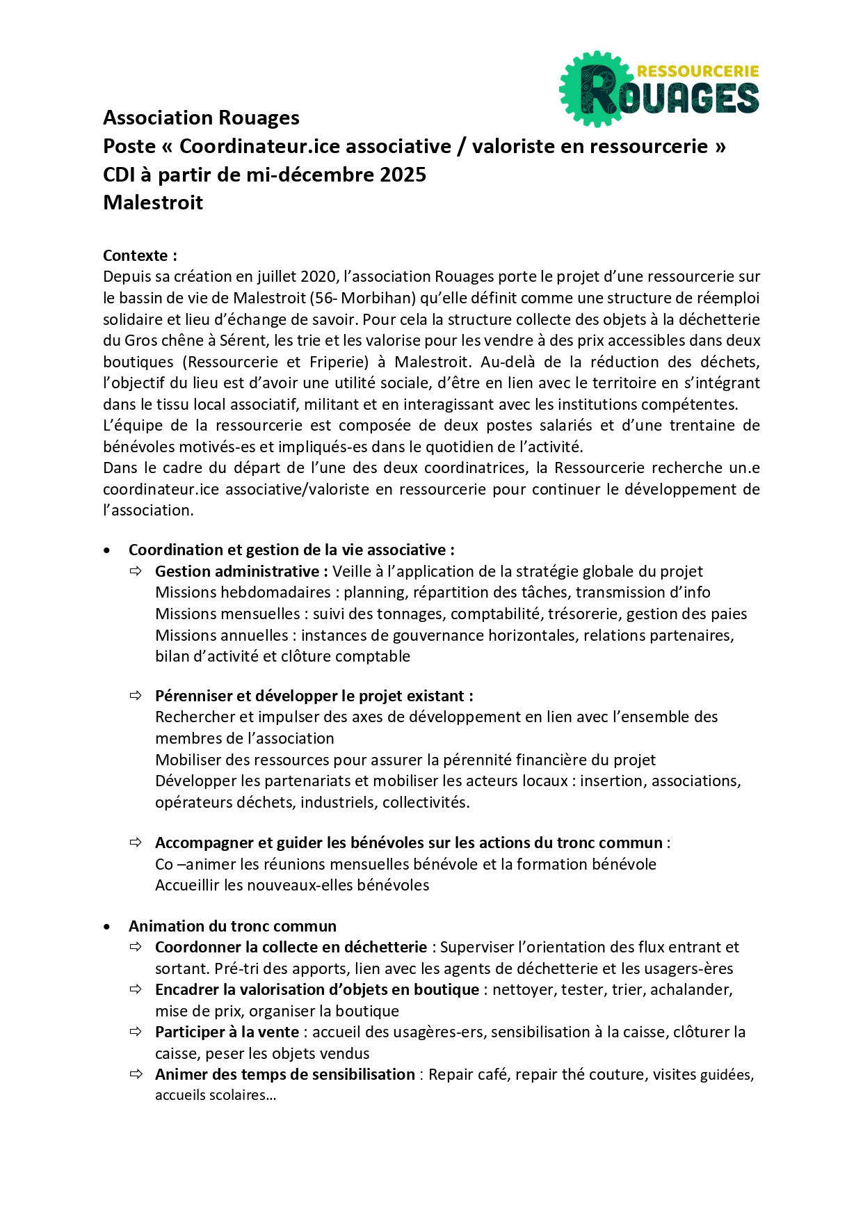 L’association Rouages, ressourcerie du bassin de vie de Malestroit, cherche un-e nouvelle "Coordinateur-rice associatif/valoriste en ressourcerie".