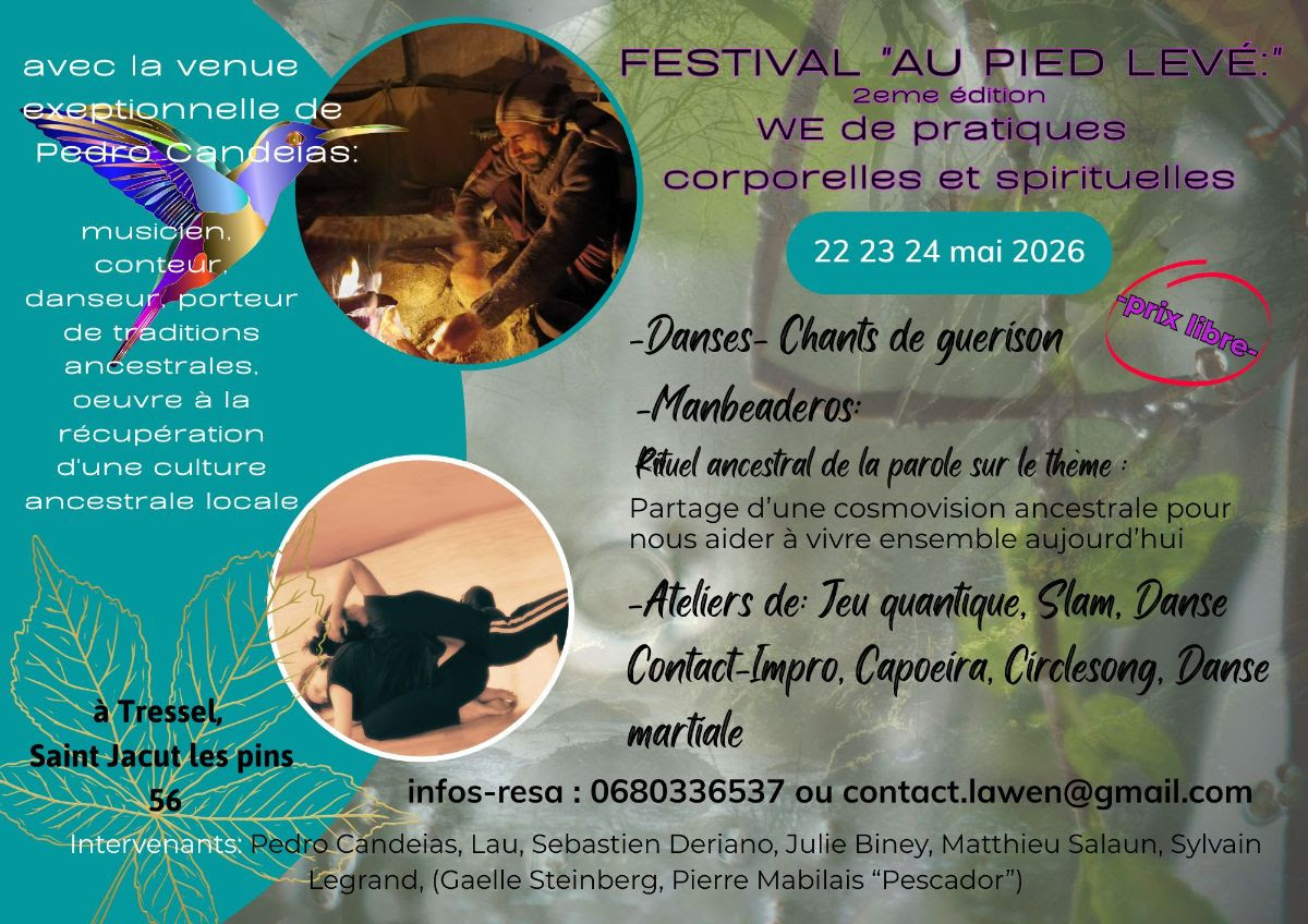 Nous sommes heureux avec Julie de rééditer le festival "Au Pied Levé", sur notre terrain. Comme l’année dernière, Pedro Candeias, de la communauté d’Enllosa sera présent pour nous transmettre danses, chants sacrés, et diriger un rituel de parole (Manbiadero). D’autres amis seront là pour animer leurs passions... entre contact-impro, capoiera, slam, jeu quantique, circle songs...