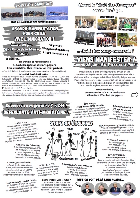 A Rennes PLACE DE LA MAIRIE 15H : Grande manifestation pour L’IMMIGRATION et contre les circulaires Retailleau.