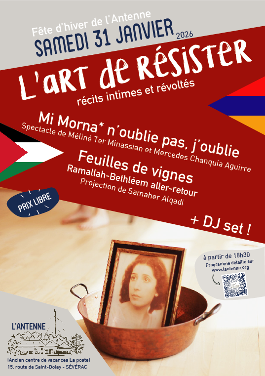 D’un côté, deux terres, le sud de la France et la Cisjordanie, qui se relient dans un présent écorché, de l’autre le réveil de l’histoire du peuple arménien dont les blessures ressurgissent et cherchent des réponses. Deux femmes prennent la parole. Leur histoire nous concerne, parce que leur destin touche à ce qui nous constitue tous.tes. Ces récits qu’elles nous adressent viennent irriguer les tissus de nos êtres. Avec le langage du théâtre ou celui du film documentaire, elles bravent la violence pour y inscrire leur élan de vie. Une soirée à mille temps, pour écouter, découvrir, échanger et danser, avec la présence lumineuse des deux artistes.
