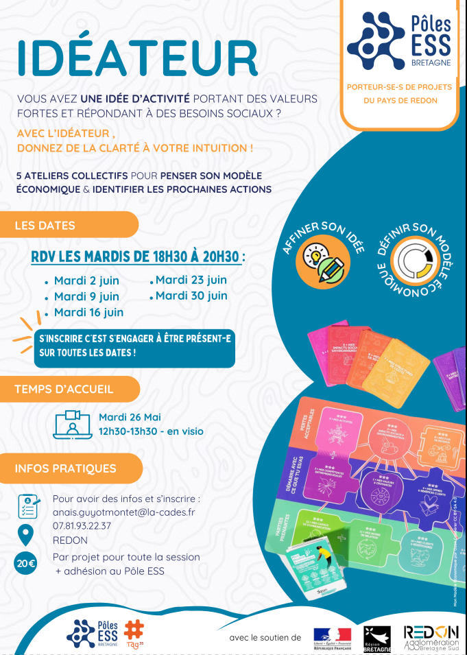 > Vous avez une idée d’activité professionnelle portant des valeurs fortes et répondant à des besoins sociaux sur le territoire ? Avec l’Idéateur (nouveau format d’animation en 2026 !), donnez de la clarté à votre idée.