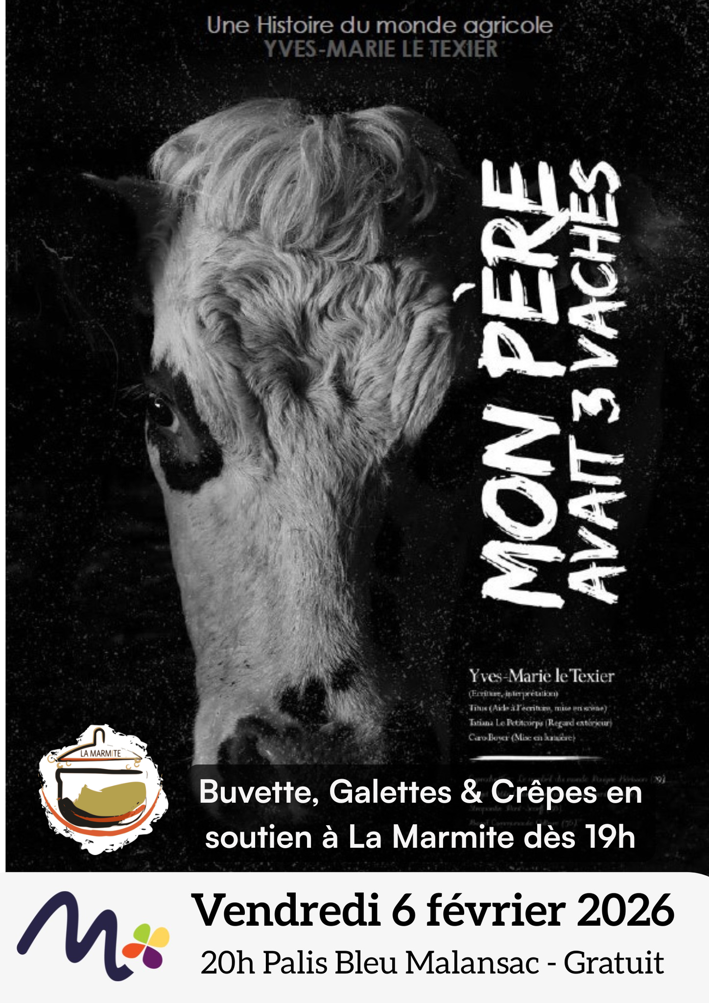 [Spectacle & Buvette / Galettes Soutien Marmite] - "Mon père avait 3 vaches" au Palis Bleu de Malansac, le vendredi 6 février à partir de 19h