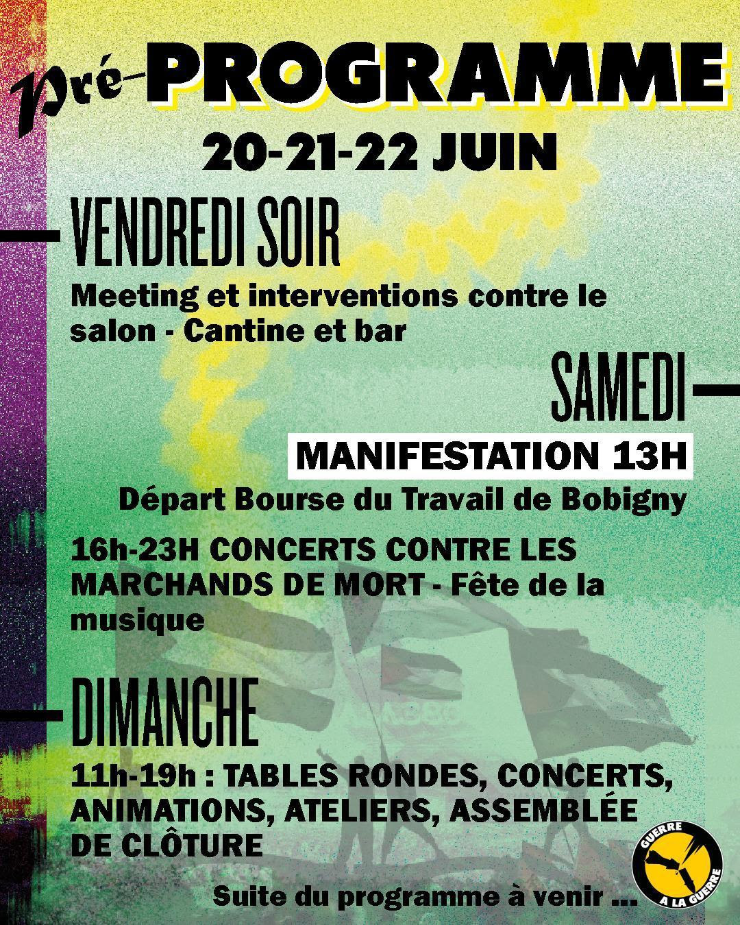 Depuis des mois, la coalition "Guerre à la guerre" regroupe les Soulèvements de la terre, Urgence Palestine, Vietnam Dioxine, Tsedek, la Marche des Solidarités et des dizaines d’organisations féministes, antiracistes et antifascistes. Pour le 21 juin, elles sont rejointes notamment par ATTAC, Solidaires, la CGT 93 et la France Insoumise qui appellent à se mobiliser contre le salon.