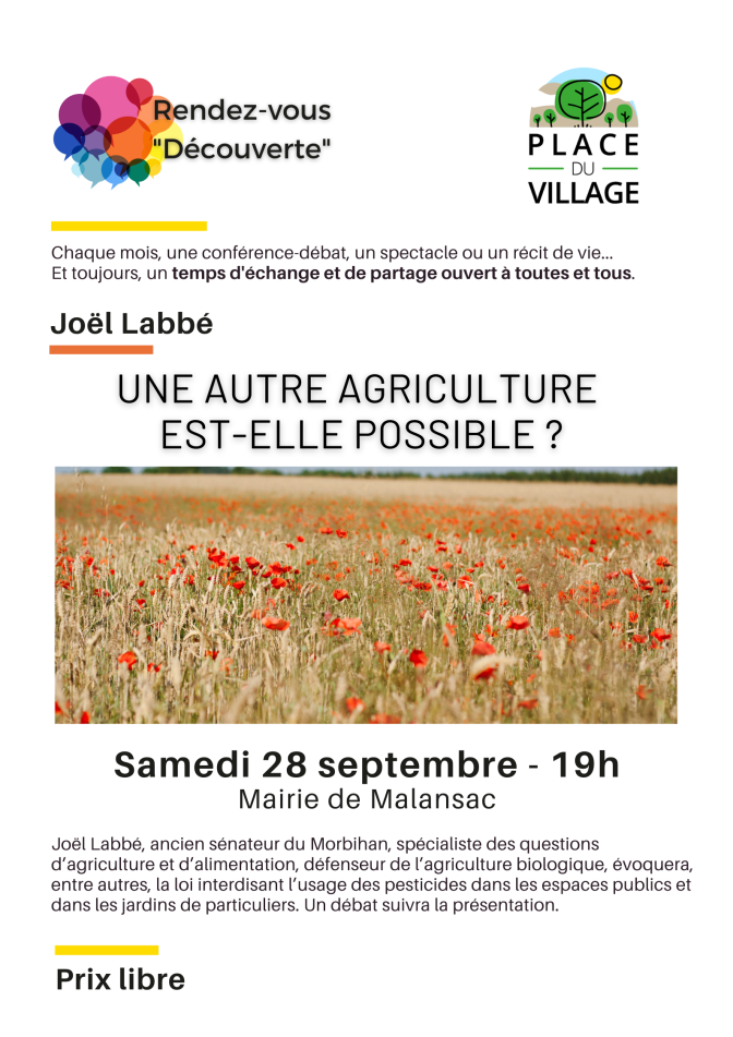 Au coeur du programme du week end de Dévelopement Durable l’association Place du Village nous propose une excellente conférence de Joel Labbe.