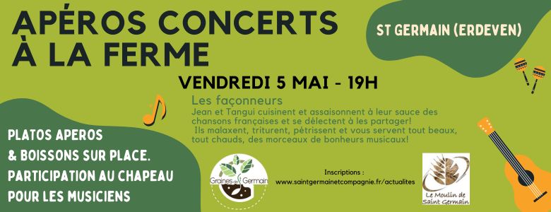 Ça sent bon le printemps ! Et avec lui le retour de nos p’tits apéro-concerts à la ferme : on vous donne donc RDV le vendredi 5 mai à St Germain (Erdeven) à 19h