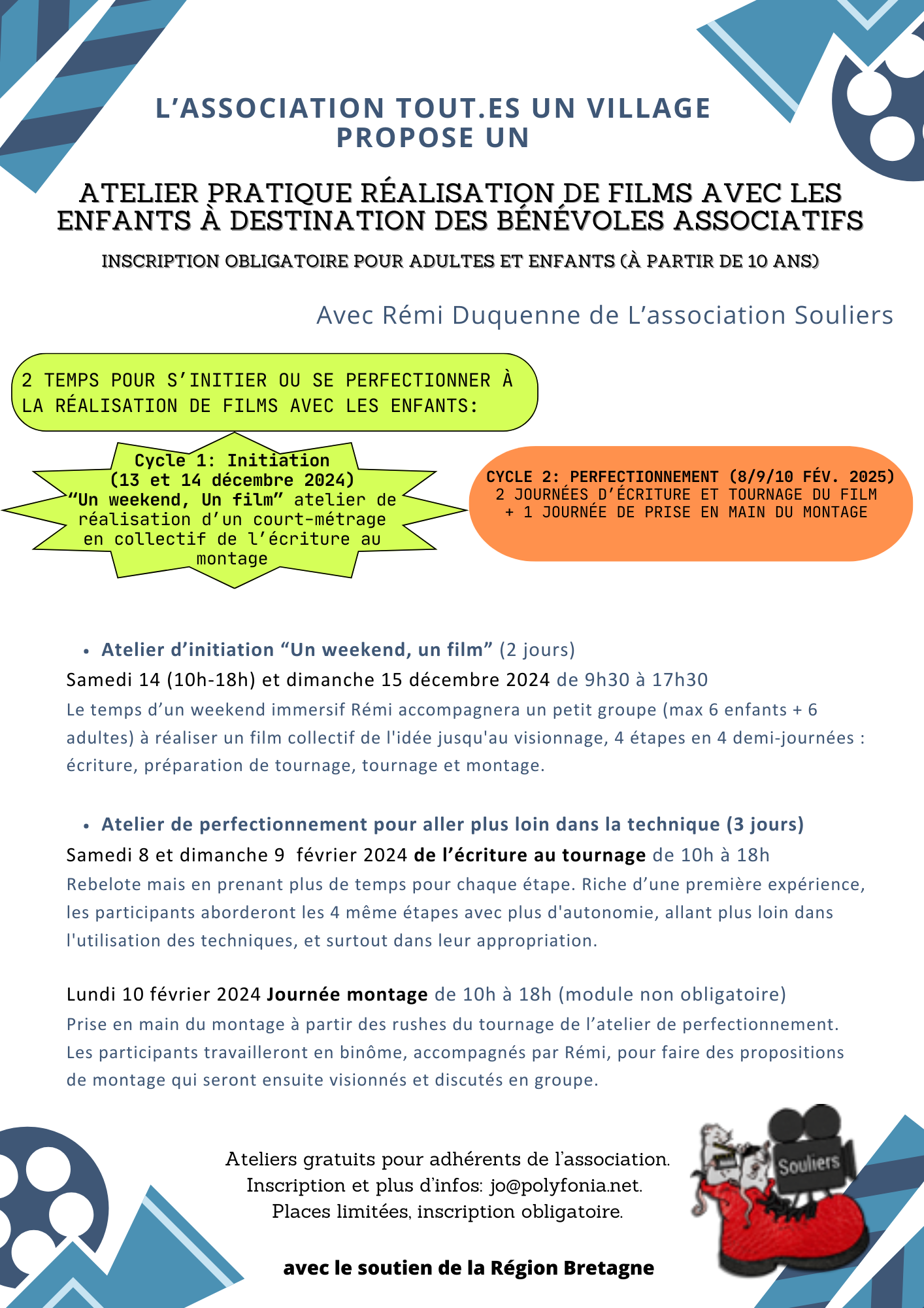 Dans le cadre de son projet associatif de café des enfants, l’association Tout.es un village organise pour la seconde année un atelier "Faire des films avec des enfants" avec Rémi Duquenne de l’Association Soulier. L’atelier s’adresse aux bénévoles associatifs ayant une première expérience cinéma ou envie d’expérimentation et qui souhaitent développer leur pratique avec des enfants. Il s’agit d’un atelier pratique en groupe mixte adultes-enfants et il est possible de s’inscrire avec son enfant (à partir de 10 ans).