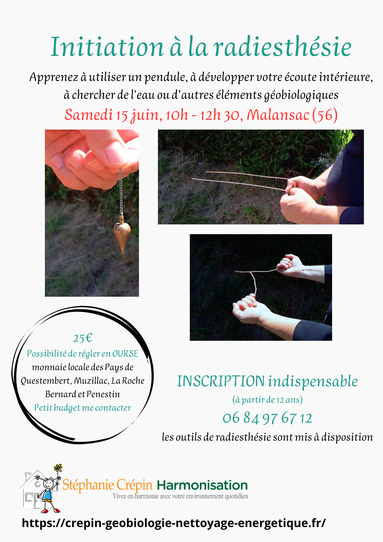 LA PRATIQUE : utilisation du pendule, des baguettes, exercices d’ancrage et de respiration ; recherche d’eau ou autres phénomènes géobiologiques in situ. Groupe restreint.
