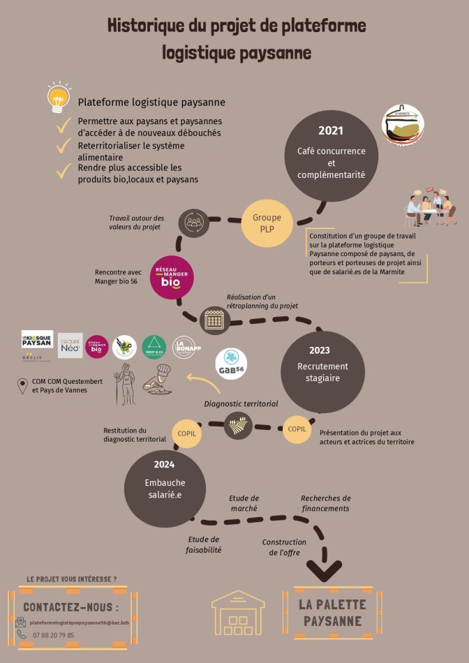 En novembre 2021, la Marmite organise une soirée discussion autour de la thématique “Nouvelles personnes installées : concurrence et/ou complémentarité ?”. Des paysan·nes installé·es et porteurs·euses de projet agricoles s’y sont retrouvé·e·s et ont construit une feuille de route pour faciliter les installations dans la partie est du Morbihan. La recherche de nouveaux débouchés vers la Restauration Hors Domicile (RHD) en constituait un des points. Un groupe de travail s’est alors constitué, le groupe PLP (plateforme logistique paysanne) est né.