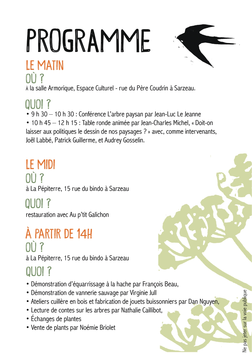 10 h 45 – 12 h 15 : Table ronde animée par Jean-Charles Michel, « Doit-on laisser aux politiques le dessein de nos paysages ? » avec, comme intervenants, Joël Labbé, ancien sénateur du Morbihan, à l’origine de la loi Labbé, Patrick Guillerme, paysan à Theix et Audrey Gosselin, chargée de mission bocage à Eau et rivières de Bretagne