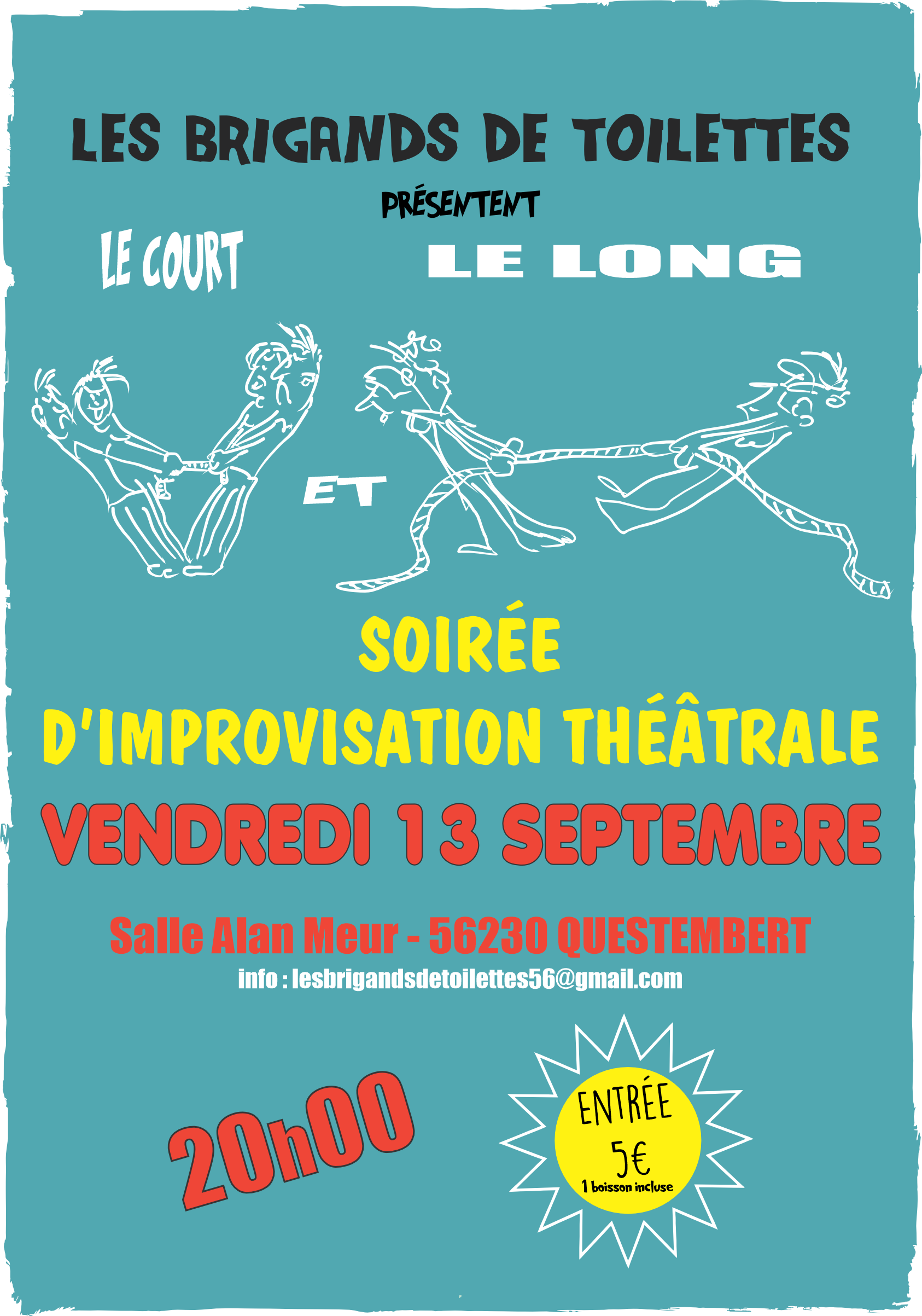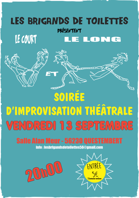 Les "Brigands de toilette " vous invitent pour leur spectacle d’improvisation de rentrée le 13 septembre à 20h salle Alan Meur à Questembert. Nous vous présenterons nos 2 formats : spectacle d’impro longue, puis spectacle d’impros courtes. Nous vous attendons nombreuses et nombreux ! Entrée 5€.