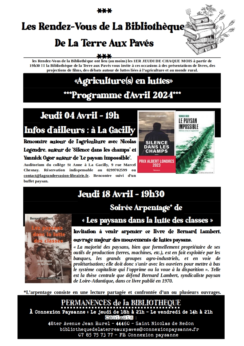[les Rendez-Vous de la Bibliothèque de la Terre aux Pavés] Agriculture(s) en luttes - Avril, Mai, Juin 2024 : programme d’Avril !!