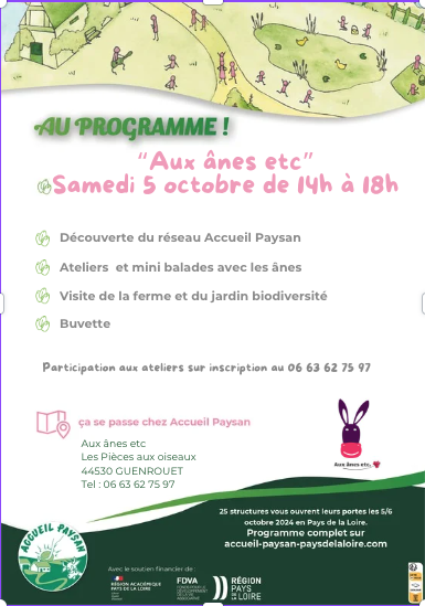 Le week-end des 5 et 6 octobre, Accueil paysan Pays de La Loire fêtera ses 30 ans... et “Aux ânes etc", qui vient tout juste d’être labellisé en accueil pédagogique, en profitera pour proposer ses premières Portes ouvertes depuis notre installation il y a huit ans déjà :-)