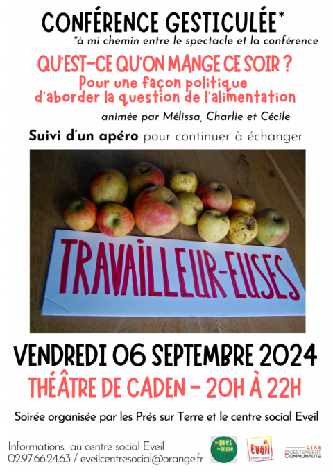 L’association les Prés sur Terre et le Centre social Intercommunal Eveil s’associent pour vous proposer la diffusion de la conférence gesticulée, à mi chemin entre spectacle et conférence : "Qu’est ce que l’on mange ce soir ? Pour une façon politique d’aborder la question de l’alimentation"