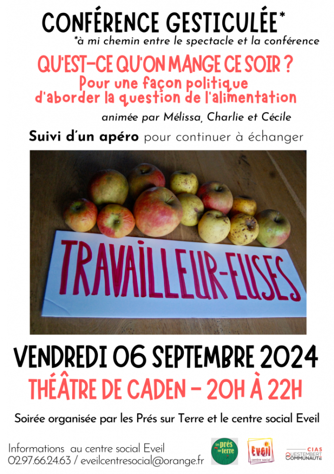 "A travers nos trois parcours de vie où s’entremêlent paysannerie, sport, cinéma, théâtre et militantisme, nous parcourons la filière de l’alimentation. Que ce soit dans la production, la transformation, la distribution ou même concernant l’accès à l’alimentation, le système repose sur des rapports de domination vis à vis des classes les plus pauvres, des femmes, des personnes racisés-es et sans papiers. En faisant une analyse de ces inégalités, nous tentons de répondre aux questions suivantes : qui décide de ce que nous mangeons ? Qui possède les moyens de production ? Qui travaille et dans quelles conditions ? Notre approche est anticapitaliste, féministe et décoloniale. Cette conférence gesticulée est née de notre rencontre au sein du groupe Sécurité Sociale de l’Alimentation du Pays de Redon."