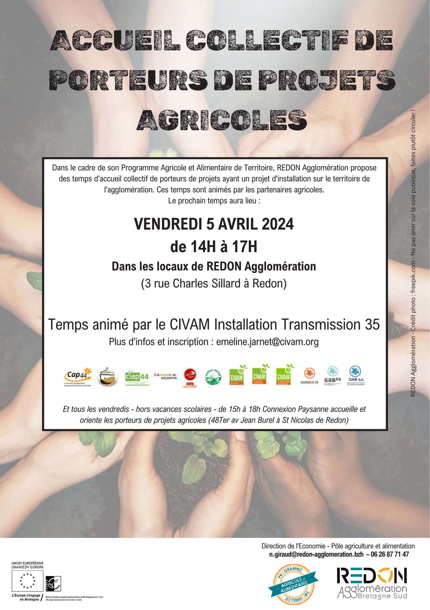 Prochain accueilde Porteurs de Projet agricole du Pays de Redon, vendredi 5 avril 14h-17h