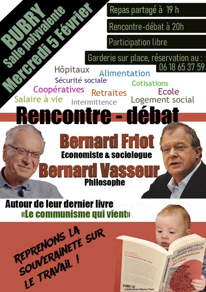 Mercredi 5 février, 20h à la salle polyvalente de Bubry : rencontre-débat avec Bernard Friot, sociologue, et Bernard Vasseur, philosophe, autour de leur dernier livre : "le communisme qui vient".